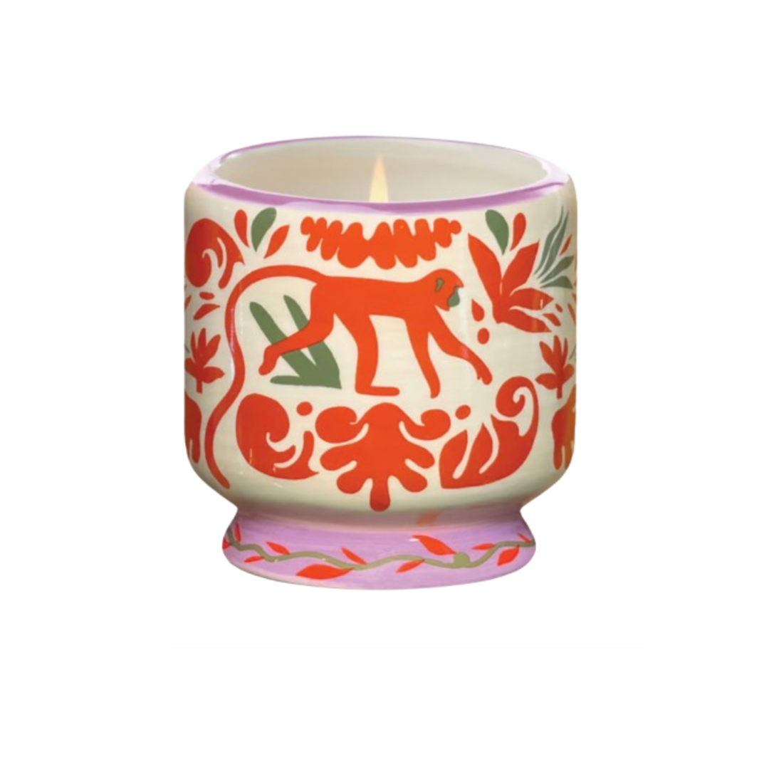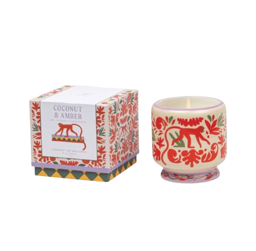 Cette bougie en céramique peinte à la main marie avec brio esthétique artisanale et signature olfactive affirmée. Son parfum riche et enveloppant, mêlant coco, patchouli et bois de santal, s'accorde parfaitement avec son design créatif et coloré.