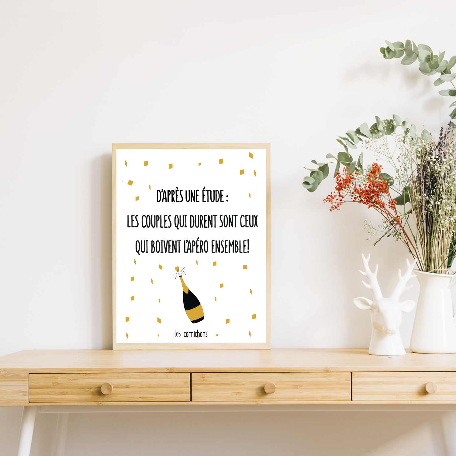 Un clin d’œil chaleureux et convivial à tous les amoureux de l’apéro à deux ! Parfaite pour votre cuisine, salon ou coin bar, cette affiche apporte humour et complicité à votre déco.