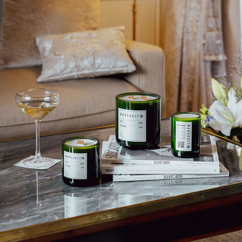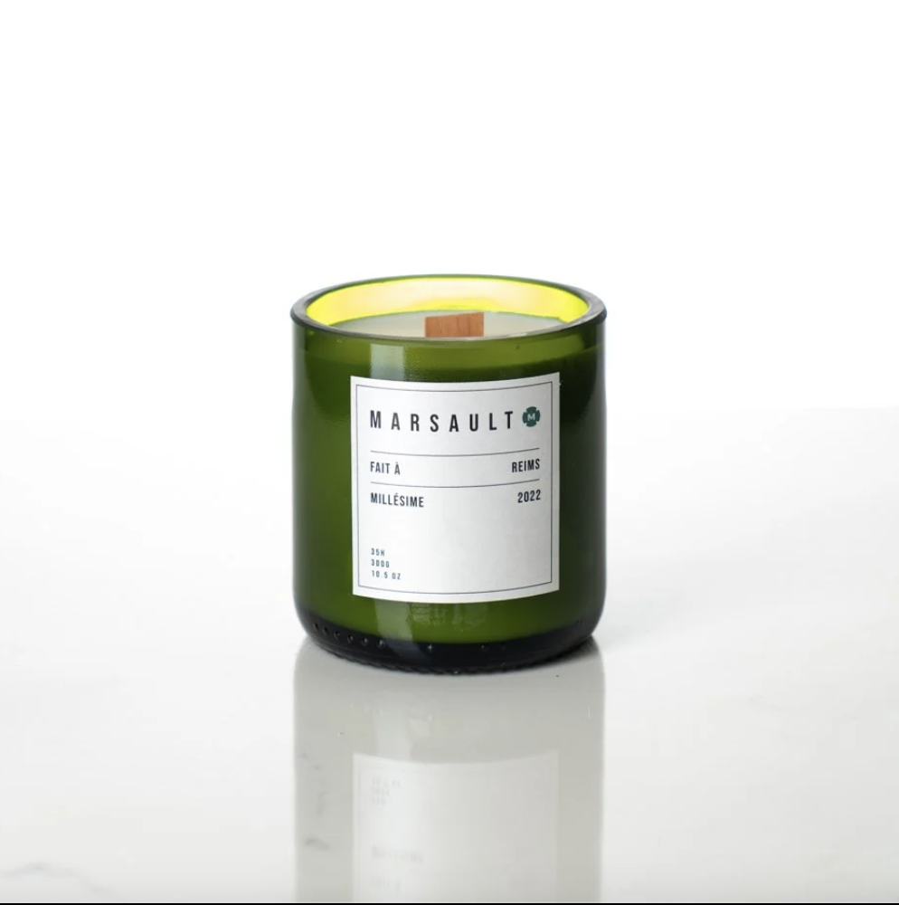 La bougie Côtes des Blancs de la marque MARSAULT est façonnée à partir d’une véritable bouteille de champagne upcyclée. Chaque pièce est coulée à la main en Champagne, à partir de cire de soja naturelle et de parfums sans substances controversées.