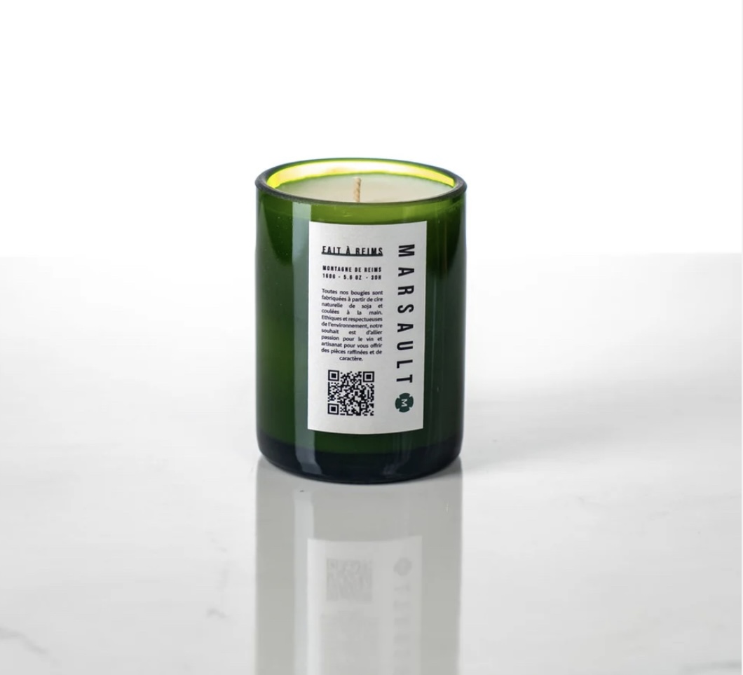 La bougie Montagne de Reims de la marque MARSAULT est conçue à partir d’une véritable bouteille de champagne upcyclée. Chaque pièce est fabriquée artisanalement en Champagne, avec des matériaux écoresponsables et une cire de soja 100 % naturelle.