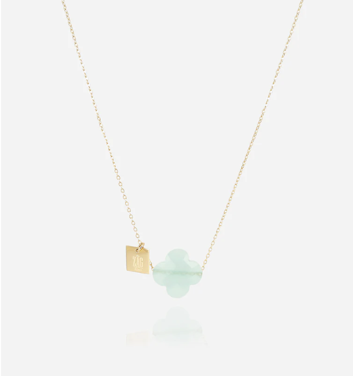 Collier chaîne en acier doré à l'or fin par ionisation, orné d’un trèfle en verre Bleu Clair.