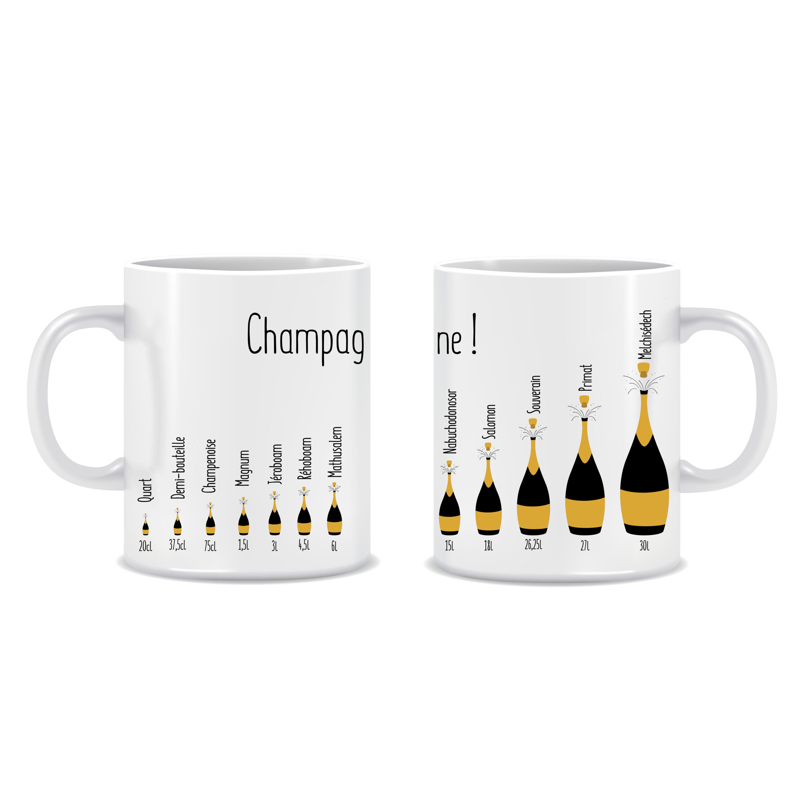 Du quart à la Nabuchodonosor, ce mug liste les tailles de bouteilles de champagne avec humour et précision. Parfait pour les amateurs éclairés… ou les buveurs curieux !